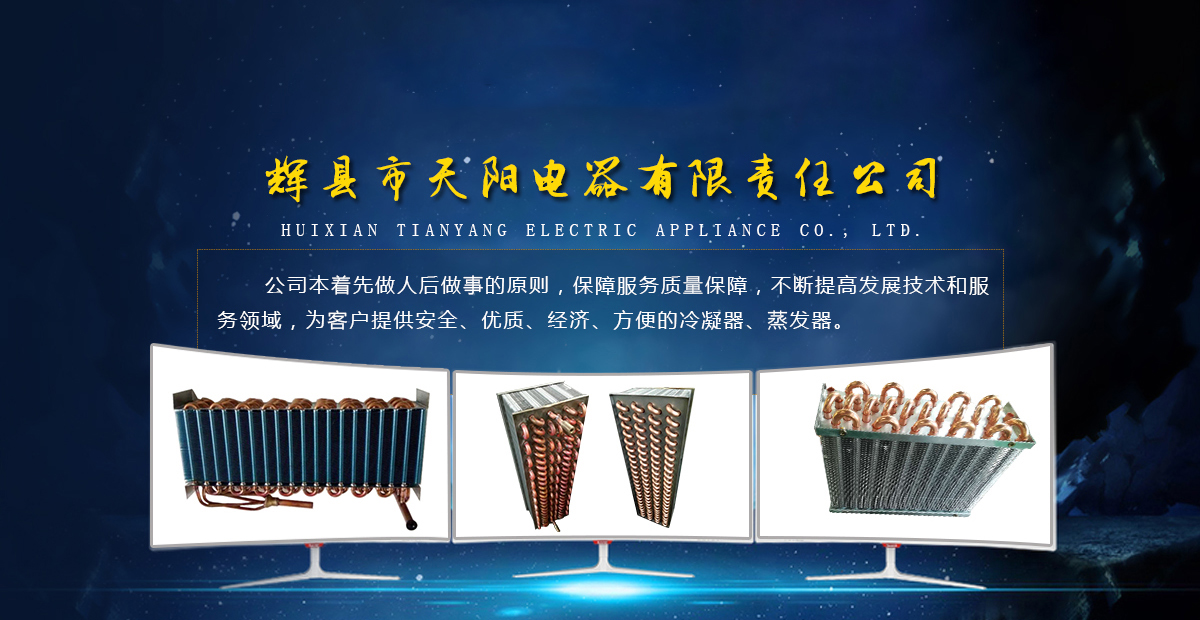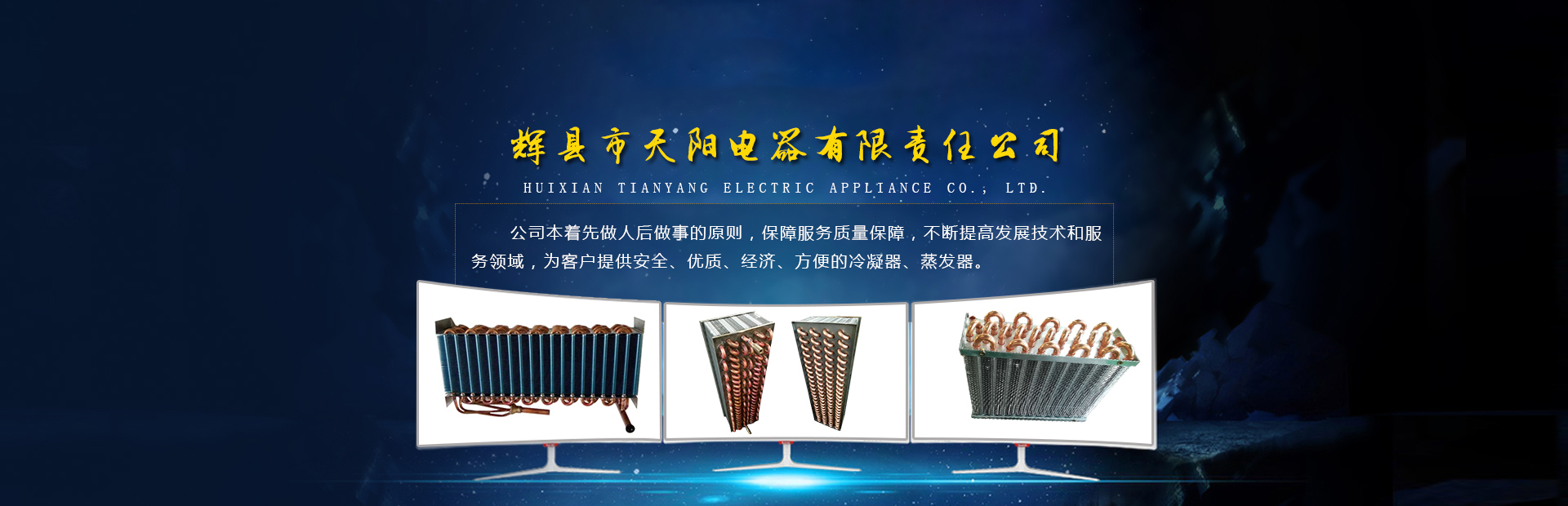 輝縣天陽(yáng)電器有限責(zé)任公司位于肥沃的中原河南省輝縣市學(xué)院路中段工業(yè)集聚區(qū)興業(yè)園3號(hào)廠房,以制冷設(shè)備用冷凝器,蒸發(fā)器,熱交換器為主。主要材料為銅管鋁翅片,銅管銅翅片,鋁管鋁翅片。廣泛應(yīng)用于冰箱冰柜,制冷設(shè)備,暖通設(shè)備,空調(diào),自動(dòng)售貨機(jī),冷干機(jī),超市立風(fēng)柜,冷藏車(chē),烘干機(jī)等產(chǎn)品領(lǐng)域。  公司自1998年成立以來(lái),始終堅(jiān)持:“科技造就產(chǎn)業(yè)、質(zhì)量成就信譽(yù)、誠(chéng)信鑄就輝煌”的質(zhì)量方針,從產(chǎn)品拓展上堅(jiān)持“人無(wú)我有,人有我優(yōu),人優(yōu)我特的”經(jīng)營(yíng)理念,25年來(lái),從1998年開(kāi)始供應(yīng)河南冰熊集團(tuán)下屬的冷柜廠,制冰機(jī)廠各種冷凝器;2003年之后,原冰熊集團(tuán)的精英志士開(kāi)始在全國(guó)各地發(fā)展,所到之處依托我公司供貨,以致于多家目前已具行業(yè)中佼佼者的公司,從而建立了如凱雪公司,兆邦公司、凌云公司、海寶公司、正雪公司、上海忠云、山東德萊維等幾十余家公司在草創(chuàng)時(shí)期的啟蒙供貨商,友好共贏長(zhǎng)達(dá)十余年,成為我國(guó)制冷行業(yè)的供應(yīng)商。以致在2015年初雙匯集團(tuán)面向社會(huì)的招標(biāo)書(shū)中指名要我公司冷凝器、蒸發(fā)器指定產(chǎn)品供應(yīng)商